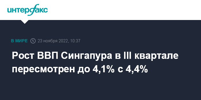 Москва. 23 ноября. INTERFAX.RU - Экономика Сингапура в третьем квартале увеличилась на 4,1% по сравнению с тем же периодом годом ранее. Об этом свидетельствуют пересмотренные данные министерства торговли и промышленности страны.