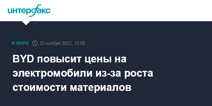 Москва. 23 ноября. INTERFAX.RU - Китайская BYD Co. Ltd, ведущий производитель автомобилей на новых источниках энергии (NEV) в КНР, увеличит цены на ряд моделей со следующего года в связи с существенным ростом стоимости материалов для производства батарей.