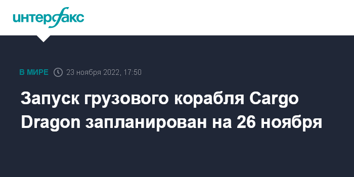 Москва. 23 ноября. INTERFAX.RU - Запуск многоразового грузового космического корабль Cargo Dragon компании SpaceX к Международной космической станции (МКС) намечен на 26 ноября, сообщило в среду Национальное управление США по аэронавтике и исследованию космического пространства (NASA).