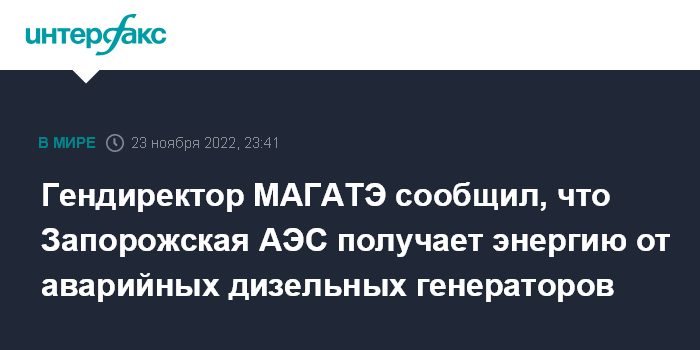 Москва. 23 ноября. INTERFAX.RU - Запорожская АЭС получает энергию от аварийных дизельных генераторов, заявил гендиректор МАГАТЭ Рафаэль Гросси.