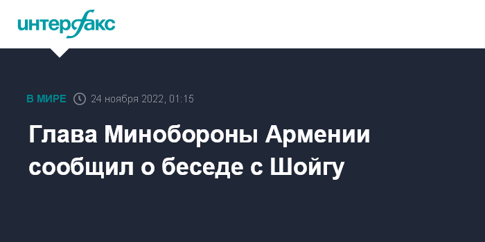 Москва. 24 ноября. INTERFAX.RU - Министр обороны Армении Сурен Папикян сообщил в социальной сети, что провел короткую беседу с министром обороны России Сергеем Шойгу.