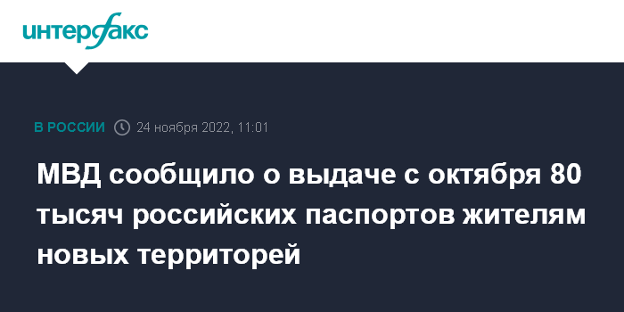 МВД сообщило о выдаче с октября 80 тысяч российских паспортов жителям новых территорей