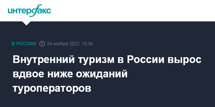 "Ожидания были в 2022 году, что спрос во внутреннем туризме будет выше, чем он получился. Если брать все направления внутри страны, то мы видим плюс 10% по отношению к прошлому году. И для участников рынка это не очень хороший результат, так как ожидалось как минимум вдвое больше", - сказала она журналистам.