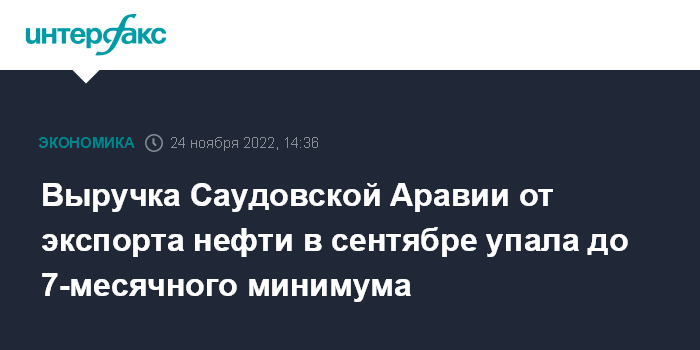 Москва. 24 ноября. INTERFAX.RU - Выручка Саудовской Аравии от экспорта нефти в сентябре достигла самой низкой отметки с марта.