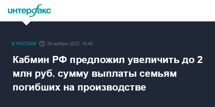 Москва. 24 ноября. INTERFAX.RU - Правительство подготовило поправки в законодательство, увеличивающие сумму единовременной выплаты семьям погибших на производстве с 1 до 2 млн рублей, сообщил премьер РФ Михаил Мишустин.