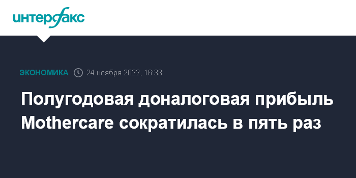 Москва. 24 ноября. INTERFAX.RU - Ритейлер товаров для беременных женщин и детей Mothercare Plc в первом полугодии 2023 финансового года, которое завершилось 24 сентября, сократил доналоговую прибыль в пять раз - до 800 тысяч фунтов ($964,4 тыс.) против 4 млн фунтов годом ранее.