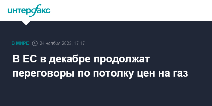 Москва. 24 ноября. INTERFAX.RU - Министры энергетики ЕС не смогли в четверг договориться по потолку цен на газ и соберутся, предположительно, 13 декабря для продолжения обсуждений, сообщает в четверг Politico.