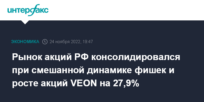 Москва. 24 ноября. INTERFAX.RU - Рынок акций РФ провел основные торги в четверг в консолидации при смешанной динамике фишек на фоне выходного в США, снижение нефти нивелировало попытки роста вслед за мировыми фондовыми площадками на сигналах от Федрезерва США о замедлении темпов дальнейшего подъема ключевой ставки. Индекс МосБиржи остался в районе 2210 пунктов, раллировали акции VEON (+27,9%) на новостях о планах продажи ПАО "Вымпелком" локальным менеджерам.