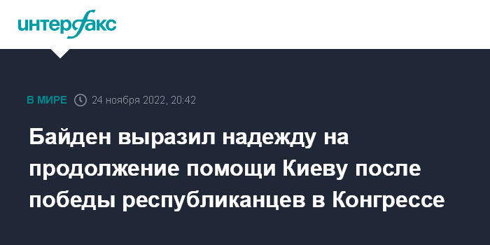 Москва. 24 ноября. INTERFAX.RU - Президент США Джо Байден выразил надежду, что помощь Украине со стороны США продолжится после того, как республиканцы получили большинство по итогам промежуточных выборов.