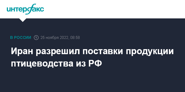 Москва. 25 ноября. INTERFAX.RU - Иран разрешил поставки птицеводческой продукции из РФ, сообщает Россельхознадзор.