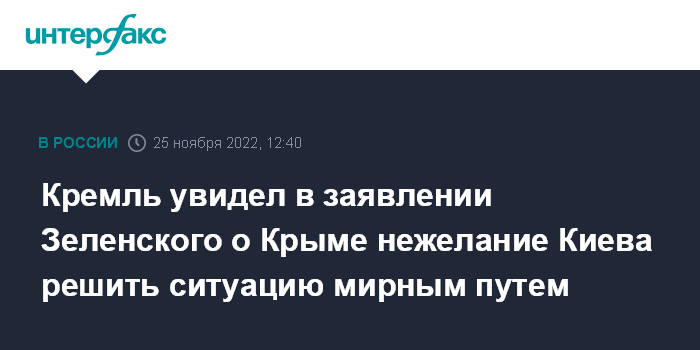 Москва. 25 ноября. INTERFAX.RU - Последние высказывания президента Украины Владимира Зеленского "о возвращении Крыма" свидетельствуют о нежелании Киева урегулировать проблемы невоенным путем, заявил пресс-секретарь президента РФ Дмитрий Песков.