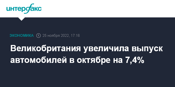 Москва. 25 ноября. INTERFAX.RU - Выпуск автомобилей в Великобритании в октябре вырос на 7,4% - до 69 524 машин против 64 729 в октябре 2021 года, показывают данные Общества производителей и продавцов автомобилей (SMMT). Показатель октября 2021 года был тогда назван худшим за 65 лет по числу выпущенных машин.