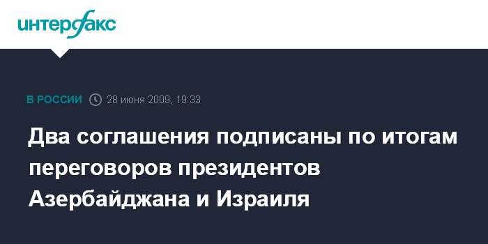 Баку. 28 июня. ИНТЕРФАКС-АЗЕРБАЙДЖАН - По итогам переговоров президентов Азербайджана и Израиля Ильхама Алиева и Шимона Переса в воскресенье в Баку подписаны два межправительственных соглашения.