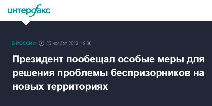 Москва. 25 ноября. INTERFAX.RU - Президент Владимир Путин, считает, что нужны особые меры для розыска беспризорных детей на новых территориях России и оказания им помощи.