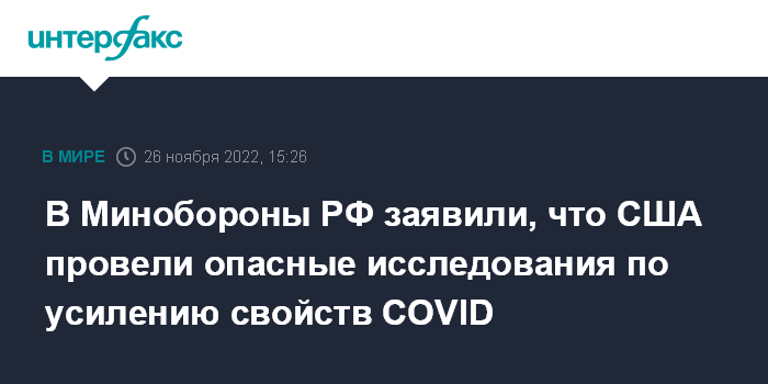 Москва. 26 ноября. INTERFAX.RU - Российские военные сообщили, что в США проведены представляющие опасность исследования по усилению свойств коронавируса на основе штаммов "омикрон" и "уханьского" варианта.