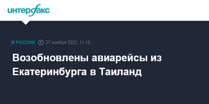 Москва. 27 ноября. INTERFAX.RU - Прямые рейсы в Таиланд вновь выполняются из международного аэропорта "Кольцово", сообщила в воскресенье пресс-служба екатеринбургской воздушной гавани.