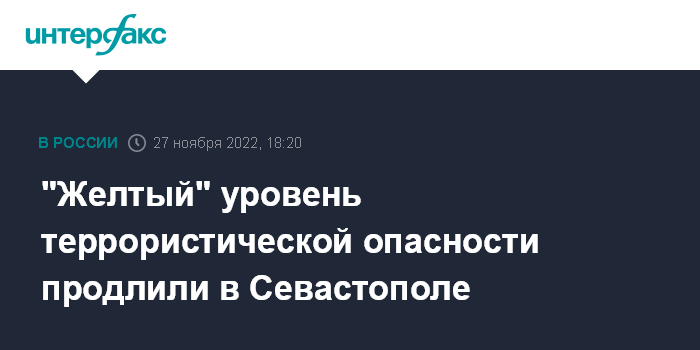 "Установлен высокий ("желтый") уровень террористической опасности на территории города Севастополя на период с 18:00 27 ноября на 15 суток до 18:00 12 декабря 2022 года", - говорится в сообщении.