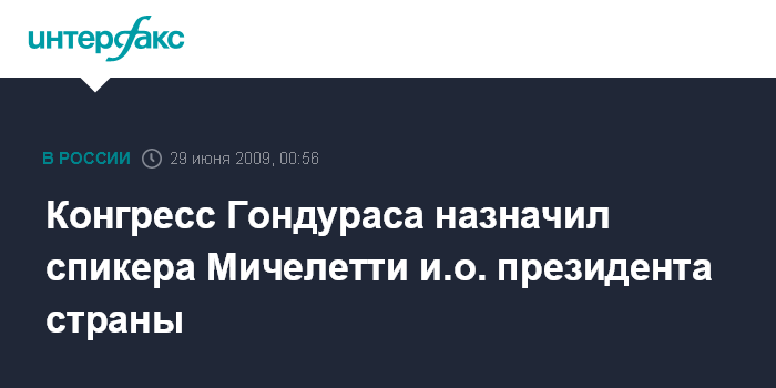 Москва. 29 июня. ИНТЕРФАКС - Национальный конгресс Гондураса принял указ, по которому исполняющим обязанности президента республики становится председатель парламента Роберто Мичелетти, сообщает сайт гондурасской газеты "Тиемпо".
