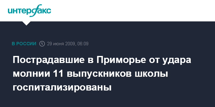 Владивосток. 29 июня. ИНТЕРФАКС - ДАЛЬНИЙ ВОСТОК - Одиннадцать выпускников школы поселка Зарубино Хасанского района Приморья, где 27 июня в результате удара молнии погибли два ученика и еще столько же пострадали, направлены в районную больницу для лечения.