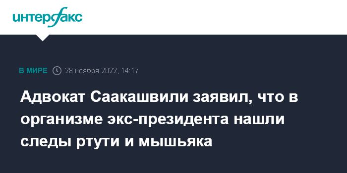 Москва. 28 ноября. INTERFAX.RU - Адвокат Шалва Хачапуридзе заявляет, что зарубежные врачи обнаружили в организме экс-президента Грузии Михаила Саакашвили наличие ртути и мышьяка.