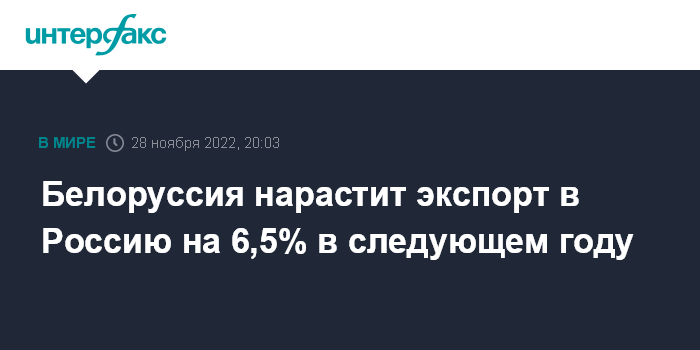Москва. 28 ноября. INTERFAX.RU - Белоруссия планирует нарастить экспорт в Россию на 6,5% в 2023 году. Такой показатель предусмотрен указом президента республики Александра Лукашенко, сообщает в понедельник президентская пресс-служба.