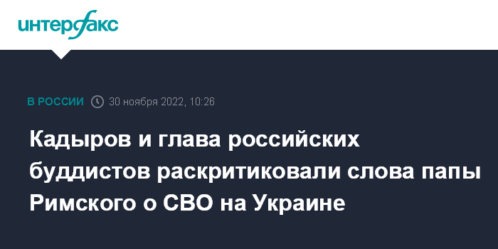 Москва. 30 ноября. INTERFAX.RU - Глава Чечни Рамзан Кадыров отверг утверждения папы Римского Франциска, который на днях заявил, что наибольшую жестокость во время спецоперации РФ на Украине проявляют военные, воспитанные "вне русской традиции", а именно чеченцы и буряты.
