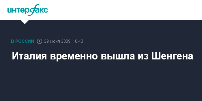 Москва. 29 июня. INTERFAX.RU - Италия временно выходит из Шенгенской зоны и устанавливает таможенные и пограничные проверки на своих границах. В связи с предстоящим саммитом "Группы восьми", который пройдет в итальянском городе Аквила, страна временно вышла из Шенгена в полночь 29 июня, передает "Немецкая волна".