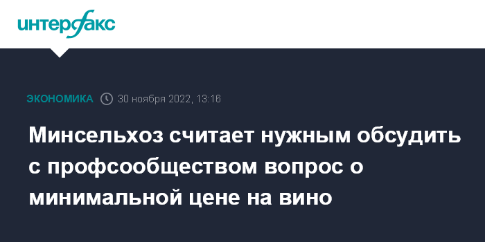 Москва. 30 ноября. INTERFAX.RU - Вопрос о введении в РФ минимальной цены на вино нуждается в проработке с профессиональным сообществом, считают в Минсельхозе.