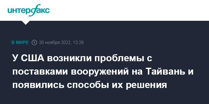 Как сообщало ранее издание The Wall Street Journal со ссылкой на источники, в американской администрации и Конгрессе высказывают опасения в связи с тем, что массированная военная помощь Украине ведет к задержкам поставок оружия Тайваню на сумму почти $19 млрд. В частности, на остров так не поступили 208 единиц Javelin и 215 единиц Stinger.