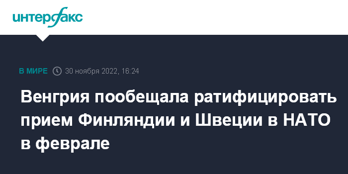 Москва. 30 ноября. INTERFAX.RU - Венгрия ратифицирует членство Финляндии и Швеции в Североатлантическом альянсе в начале февраля, заявил глава МИД Финляндии Пекка Хаависто журналистам в среду в Бухаресте.