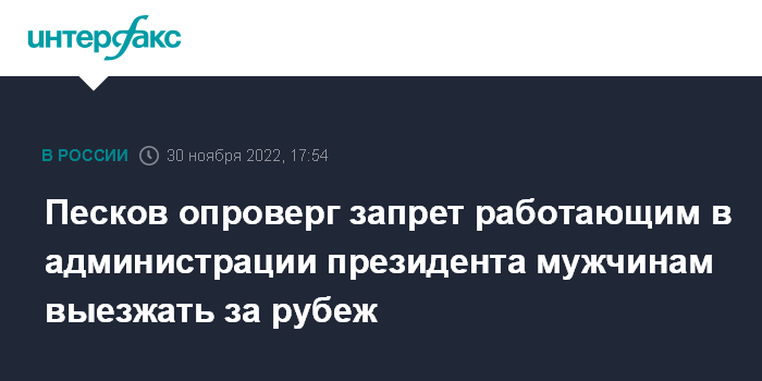 Москва. 30 ноября. INTERFAX.RU - Пресс-секретарь президента РФ Дмитрий Песков опроверг появившуюся в телеграм-каналах информацию о том, что для сотрудников администрации президента - мужчин временно введен запрет на выезд за рубеж в командировки и в отпуск.