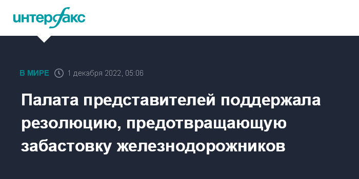 Москва. 1 декабря. INTERFAX.RU - Палата представителей США приняла в среду резолюцию, которая предотвращает забастовку железнодорожников, сообщают американские СМИ.