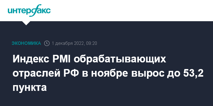 Москва. 1 декабря. INTERFAX.RU - Индекс PMI обрабатывающих отраслей РФ в ноябре 2022 года составил 53,2 пункта, поднявшись с октябрьских 50,7 пункта, говорится в материалах исследования S&P Global.