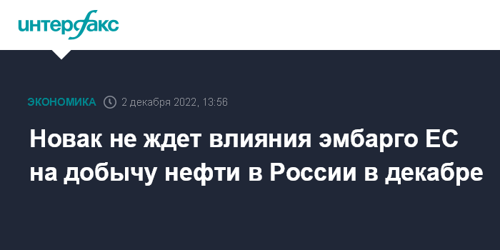 Москва. 2 декабря. INTERFAX.RU - Эмбарго Евросоюза на покупку российской нефти, которое начинает действовать с 5 декабря, не повлияет на уровень добычи нефти в России в декабре, поскольку контракты заключены ранее, заявил вице-премьер РФ Александр Новак.