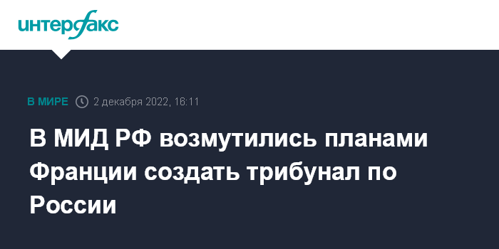 Москва. 2 декабря. INTERFAX.RU - В Москве выражают возмущение планами Франции по созданию специального трибунала по расследованию действий России на Украине, исключают возможность наличия у него юрисдикции над Россией, заявили в пятницу в МИД РФ.
