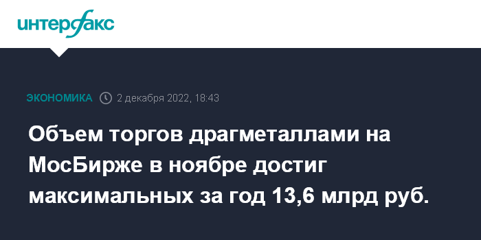 Москва. 2 декабря. INTERFAX.RU - Суммарный объем торгов драгоценными металлами на Московской бирже в ноябре составил 13,61 млрд рублей, следует из материалов биржи.