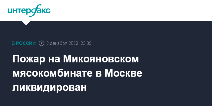 Москва. 2 декабря. INTERFAX.RU - Пожарные потушили огонь на крыше Микояновского мясокомбината в Москве, сообщили "Интерфаксу" в МЧС РФ в пятницу вечером.