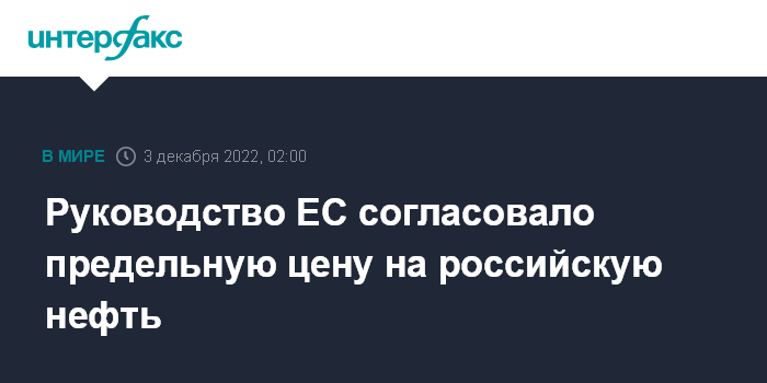 Как сообщалось ранее, постпреды стран ЕС согласовали потолок цен на российскую нефть на уровне в $60 за баррель. Решение вступит в силу после публикации соответствующего документа в Официальном журнале ЕС.