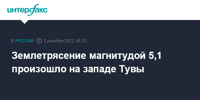 Москва. 3 декабря. INTERFAX.RU - Подземный толчок магнитудой 5,1 зафиксирован в субботу в 301 км западнее Кызыла (Тува), сообщает Алтае-Саянский филиал Единой геофизической службы РАН. По данным оперативной обработки Алтае-Саянского филиала, эпицентр зарегистрированного в 03:39 мск землетрясения находился в 31 км север-западнее города Ак-Довурак.