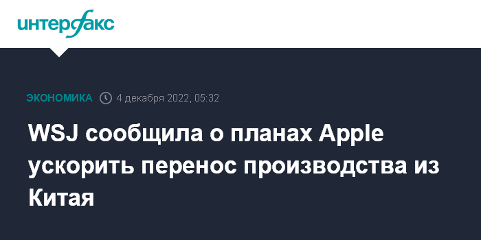 Москва. 4 декабря. INTERFAX.RU - Американская Apple Inc. в последние недели ускорила планы по переносу части своего производства за пределы Китая, который долгое время доминировал в цепочке поставок самой дорогой компании в мире, сообщает The Wall Street Journal со ссылкой на источники, участвующие в обсуждении планов.