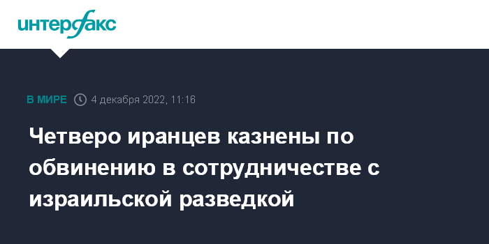 Москва. 4 декабря. INTERFAX.RU - Смертные приговоры в отношении четверых человек, признанных виновными в сотрудничестве с израильской разведкой, привели в исполнение в воскресенье в Иране, сообщает межарабский телеканал Al Arabiya.