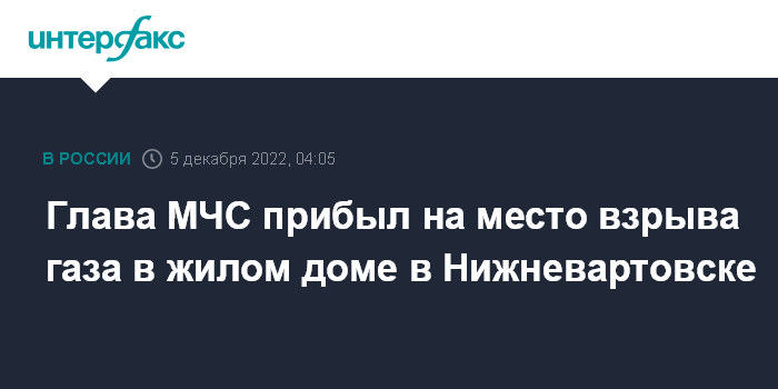 Ранее сообщалось, что взрыв, предположительно, газового баллона произошел 4 декабря в пятиэтажном доме в Нижневартовске на улице Мира около 18:30 по местному времени. Возбуждено уголовное дело.