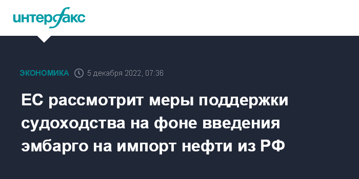 ЕС рассмотрит меры поддержки судоходства на фоне введения эмбарго на импорт нефти из РФ
