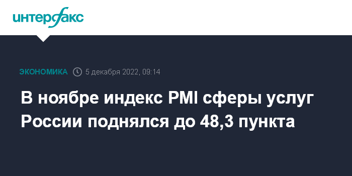 Москва. 5 декабря. INTERFAX.RU - В ноябре 2022 года индекс PMI сферы услуг России составил 48,3 пункта, поднявшись с октябрьского значения 43,7 пункта, показало исследование S&P Global.