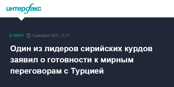 Москва. 5 декабря. INTERFAX.RU - Командующий курдско-арабской коалицией Сирийские демократические силы, контролирующей северо-запад Сирии, Мазлум Абди заявил о готовности к мирным переговорам с Турцией.