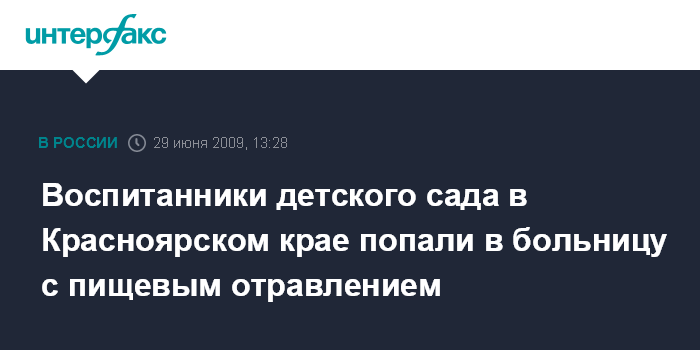 Красноярск. 29 июня. INTERFAX.RU - Врачи поселка Нижняя Пойма в Красноярском крае госпитализировали из местного детского сада "Сибирячок" 26 детей в возрасте от трех до шести лет с диагнозом "пищевое отравление".