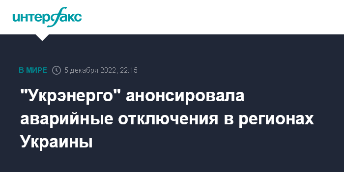 Москва. 5 декабря. INTERFAX.RU - Украинская компания НЭК "Укрэнерго" анонсировала применение аварийных отключений электроэнергии в регионах из-за временного снижения мощности генерации.