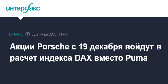 Москва. 6 декабря. INTERFAX.RU - Акции автопроизводителя Porsche AG войдут в расчет германского фондового индекса DAX с 19 декабря, говорится в сообщении Deutsche Boerse.