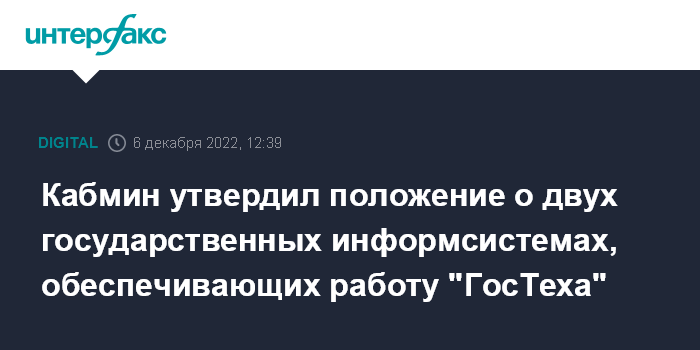 Москва. 6 декабря. INTERFAX.RU - Правительство РФ утвердило постановление о двух новых государственных информационных системах (ГИС) "Госмаркет" и "Управление платформой "ГосТех". Они регламентируют работу платформы "ГосТех", на которую с 2023 г. будут обязаны перейти госорганы.