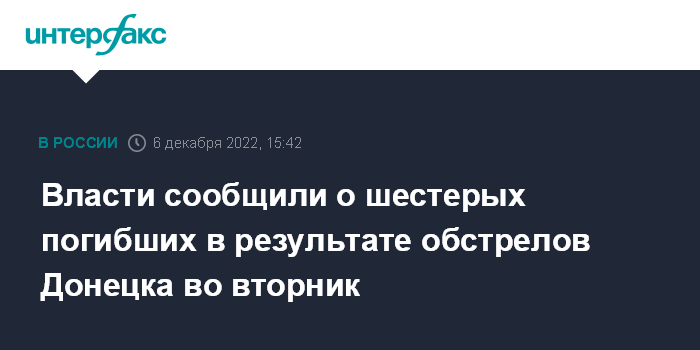 Москва. 6 декабря. INTERFAX.RU - Шестеро мирных жителей погибли в результате обстрелов Донецка во вторник, еще 10 человек пострадали, сообщают местные власти.